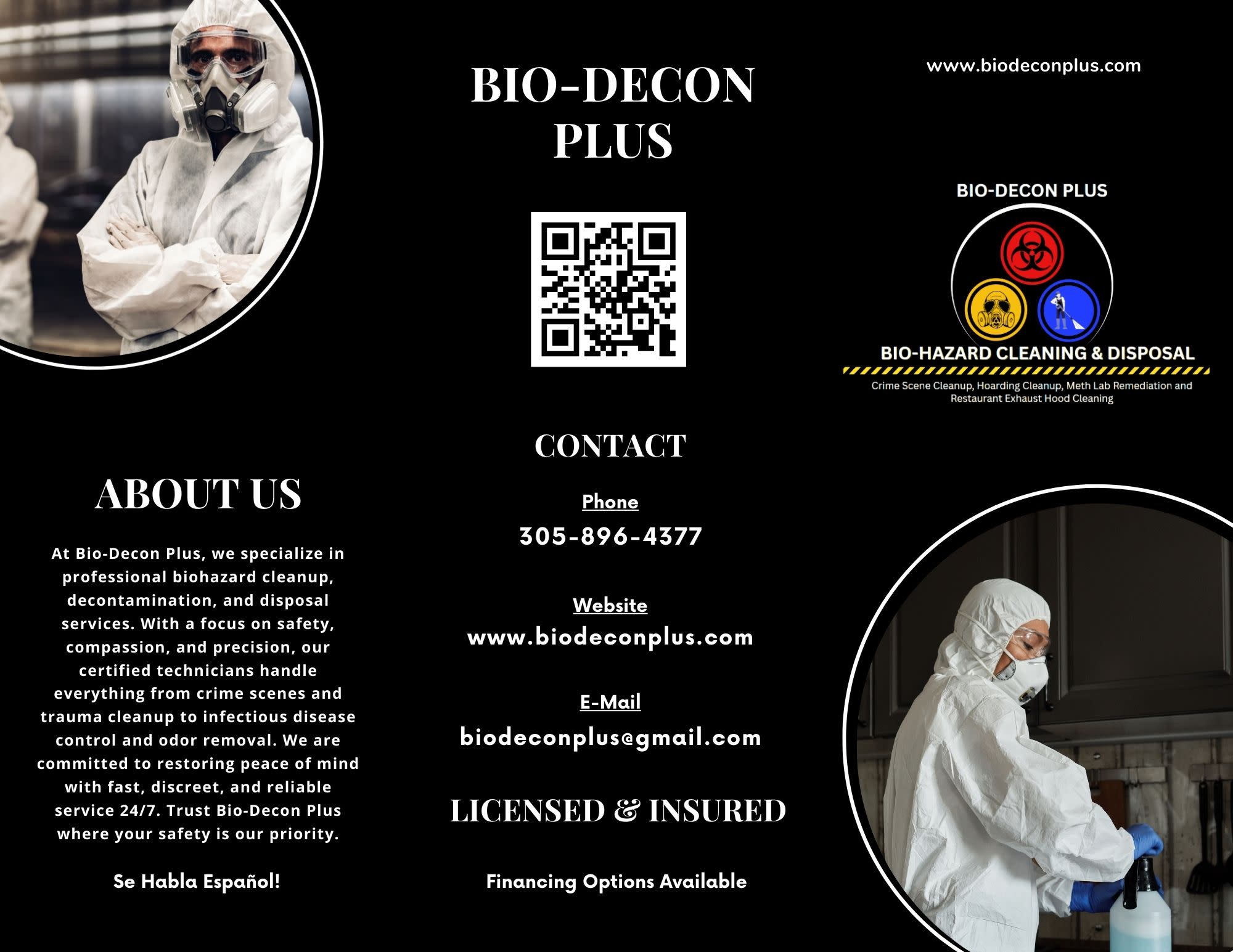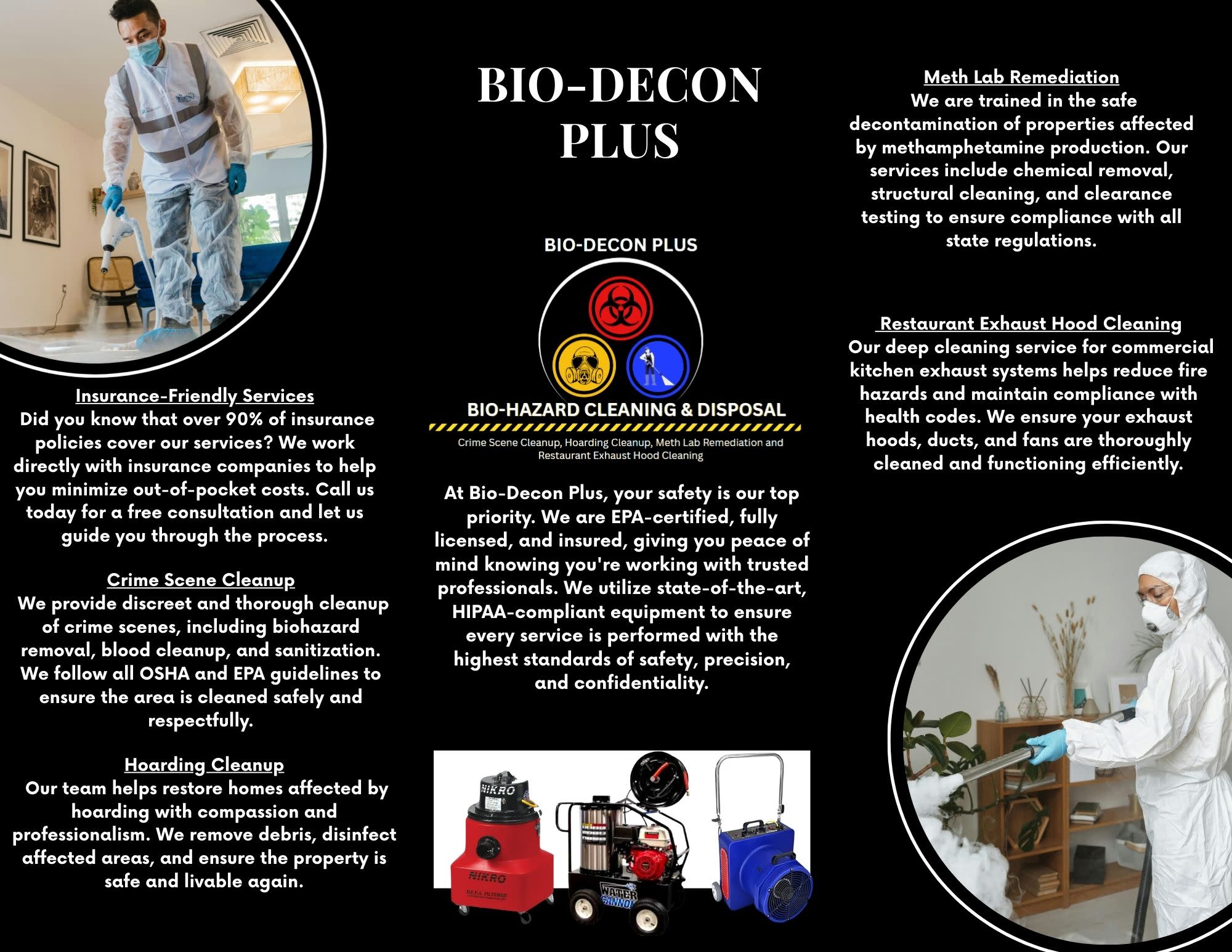 At Bio-Decon Plus, we specialize in professional biohazard clean-up, decontamination, and disposal services. With a focus on safety, compassion, and precision, our certified technicians handle everything from crime scenes and trauma cleanup to infectious disease control and odor removal. We are committed to restoring peace of mind with fast, discreet, and reliable service 24/7. Trust Bio-Decon Plus where your safety is our priority.