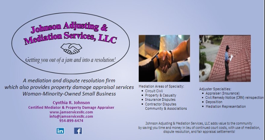 Cynthia Johnson is the owner and founder of Johnson Adjusting & Mediation Services, an emerging dispute resolution and property damage appraisal firm, servicing the South Florida community. She is a Florida Supreme Court Certified Circuit Civil Mediator and property damage appraiser. Cynthia is a woman and minority entrepreneur, and an engine for social and economic growth in her community.