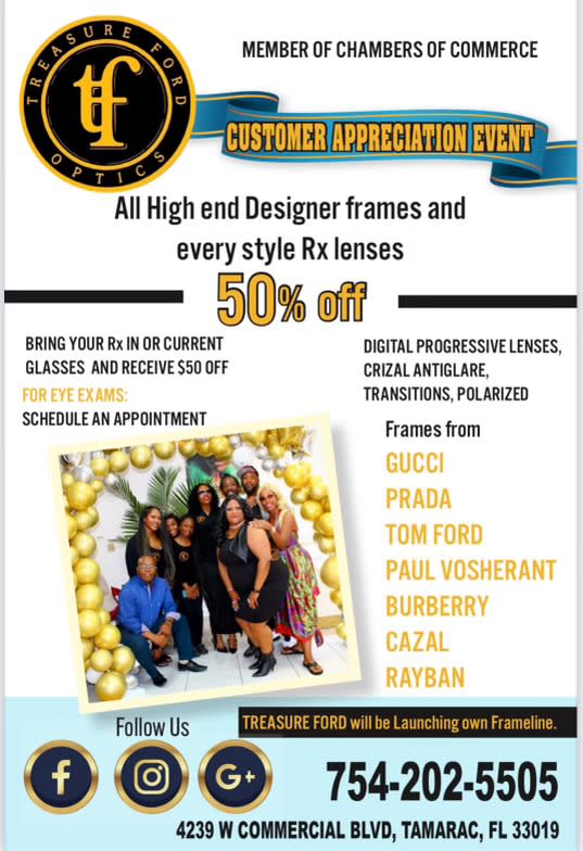 Treasure Ford Optics Back to Search Treasure Ford Optics Categories Optical Services 4239 W Commercial Blvd , Tamarac , FL , 33319 (754) 202-5505 https://www.facebook.com/profile.php?id=100086547037656 https://www.instagram.com/treasurefordoptics/ Images Images × Contacts Chanel Ford Share × Print Email Facebook LinkedIn X Pinterest Powered By GrowthZone