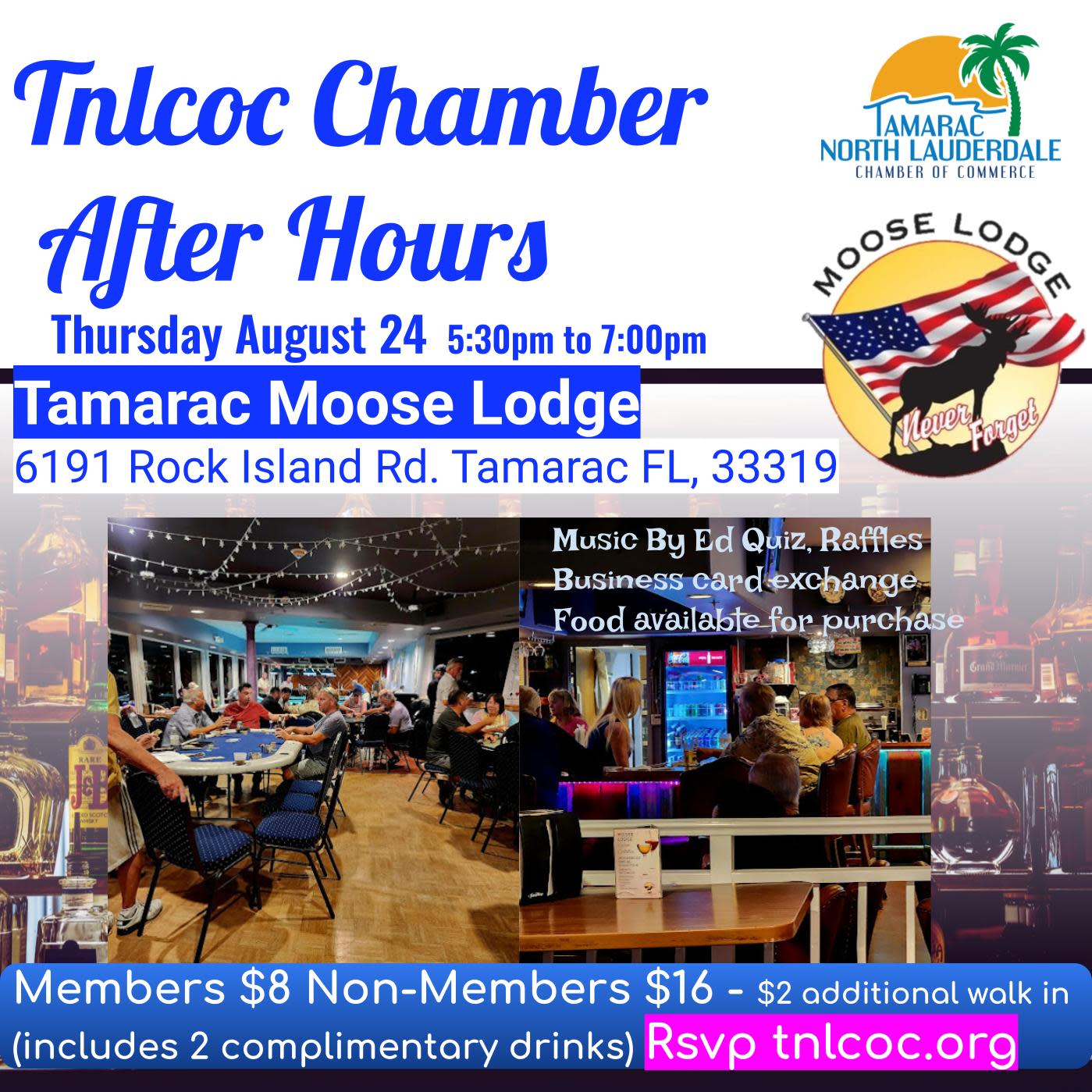 Thursday night at the Moose Lodge is a popular evening with a delicious selection of American food. The Tamarac North Lauderdale Chamber has an exclusive 2 drink special and a fun thought provoking quiz by member Music By Ed. Test your knowledge, be in the free raffle drawing and most important make connections and build relationships that will grow your business. Make sure you Rsvp so we can prepare a $2 additional walk in charge will be applied.