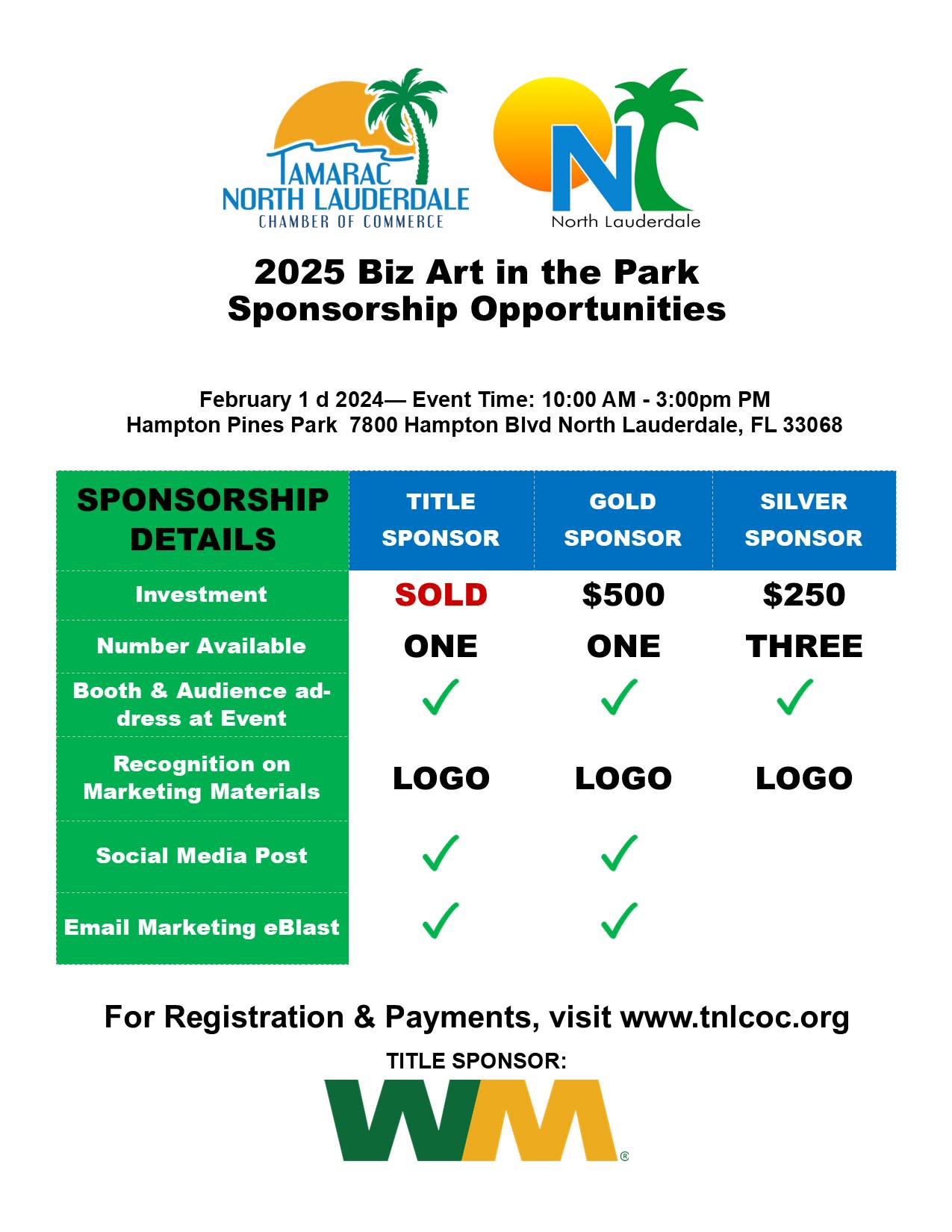 Get ready for a day of creativity and fun! Join us at Biz Art in the Park 2025 on February 1st at Hampton Pines Park, 7800 Hampton Blvd, North Lauderdale, FL 33068. This annual arts and craft event is proudly supported by North Lauderdale and partner WM and the Tamarac North Lauderdale Chamber. Enjoy live music, local artisans, and delicious food. Live performances, music, food and local artists. We are seeking vendors with original hand made artwork and sponsors to help us present a great event again. Mark your calendars and we'll see you there!