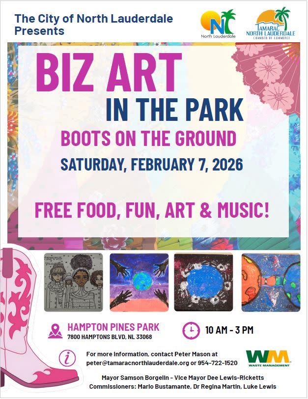 Biz Art in the Park the Sixth Annual Biz Art in the Park event Saturday February 7, 2026 at Hampton Pines Park located at 7800 Hampton Blvd., North Lauderdale, FL 33068. This is a free community event designed to bring together the City of North Lauderdale business community, local residents, and educational community featuring arts and crafts booths displaying original handmade artwork.