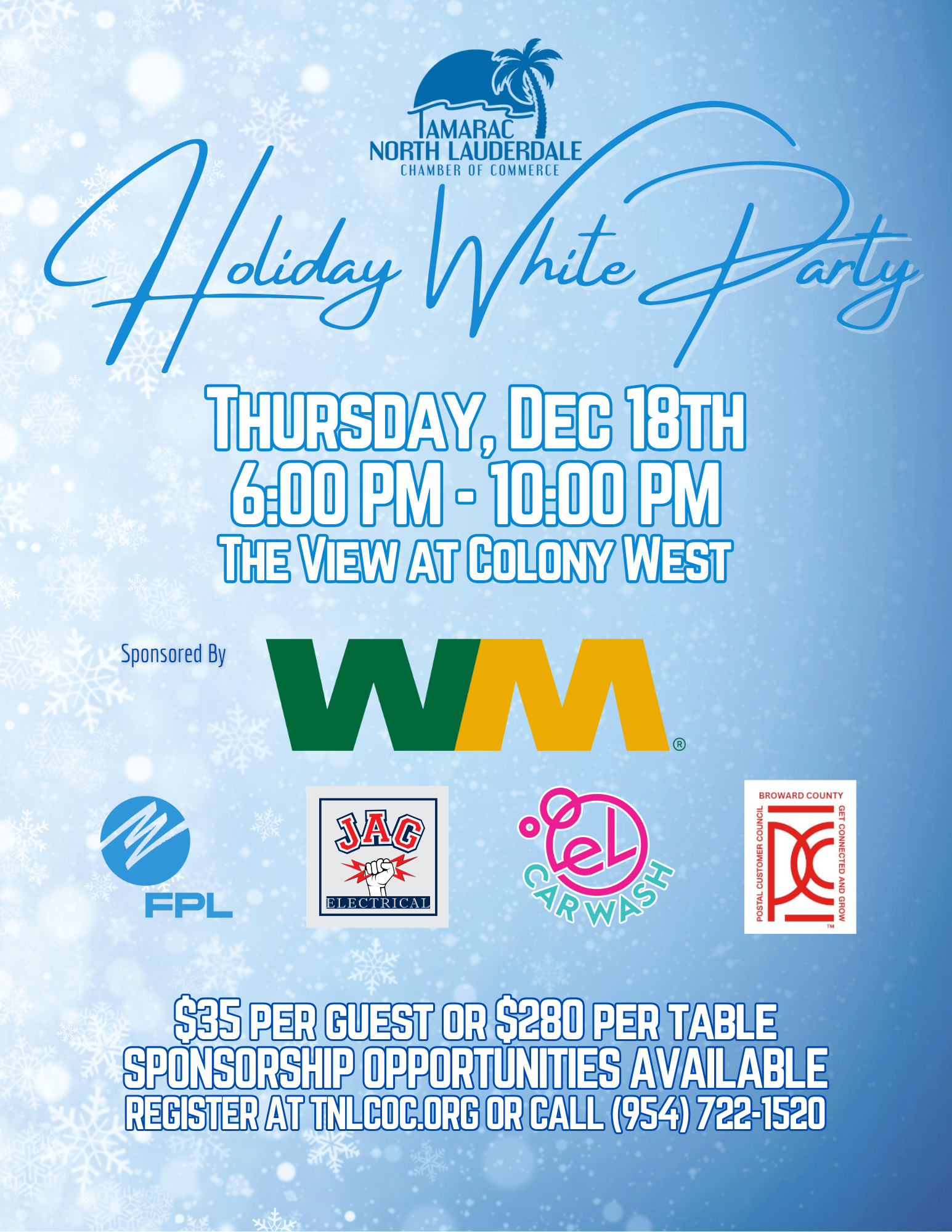The Chamber is having a fun evening together at the annual Chamber Holiday Party held at The View at Colony West 6850 N Pine Island rd Tamarac 33321 6pm to 10pm. This popular event is sponsored by WM https://www.wm.com/ and Florida Power and Light https://www.fpl.com/. This is a great way to meet elected leaders, community leaders, local businesses and friends of the Chamber. A great opportunity to build relationships in a casual setting.