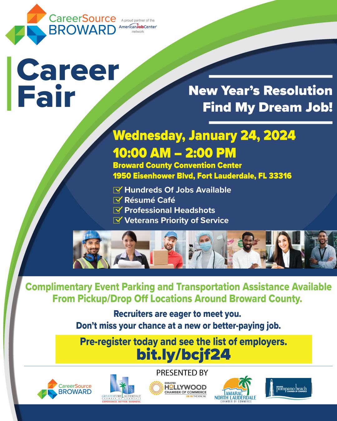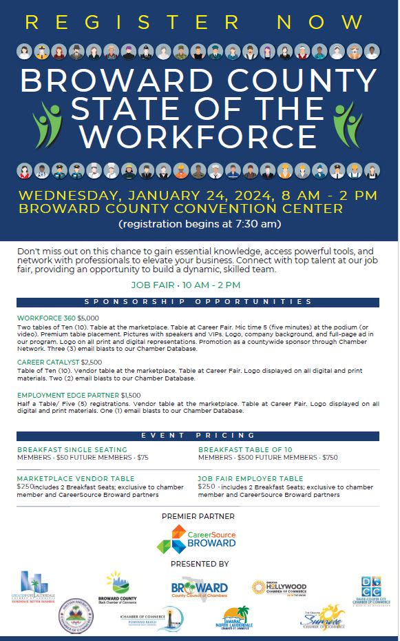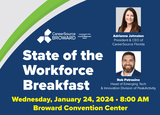 FORT LAUDERDALE, Fla. (January 4, 2024) - CareerSource Broward (CSBD) and the Greater Fort Lauderdale Chamber of Commerce, Greater Hollywood Chamber of Commerce, Pompano Beach Chamber of Commerce, and Tamarac North Lauderdale Chamber of Commerce jointly present the “State of the Workforce” inaugural event on Wednesday, January 24, from 7:30 a.m. to 2 p.m., at the Broward County Convention Center (1950 Eisenhower Blvd.). This event will unite all sectors of the business community seeking to learn about vital labor trends, services, and new business technologies such as A.I. that are impacting the Broward economy. This three-part professional growth opportunity includes a networking Business Breakfast, an Employer Marketplace, and a Job Fair that will bring a ready-to-work, motivated workforce to community employers.
