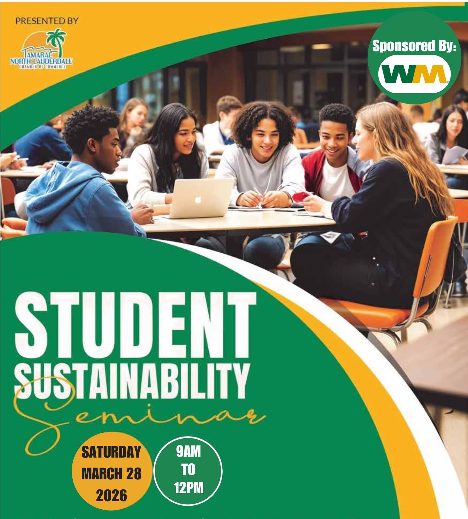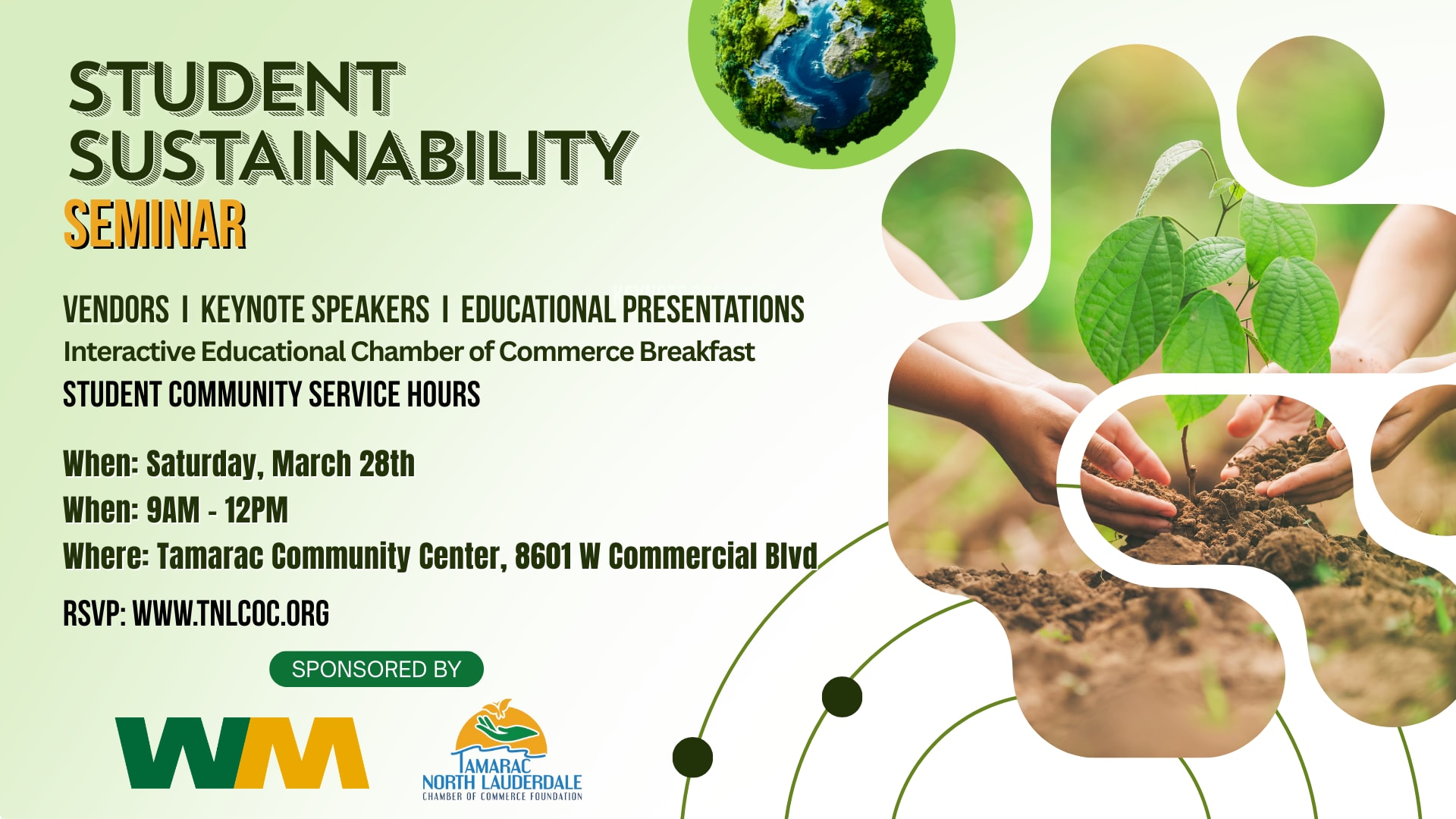 Join us Saturday, March 28, 9 AM–12 noon at the Tamarac Community Center (8601 W. Commercial Blvd.) for a Student Sustainability Seminar featuring free breakfast and lunch, interactive presentations, raffles, gift-card quiz, and 4 community service hours. Learn about sustainability careers, discover how the green economy shapes your future, and have fun while earning hours—don’t miss it!”