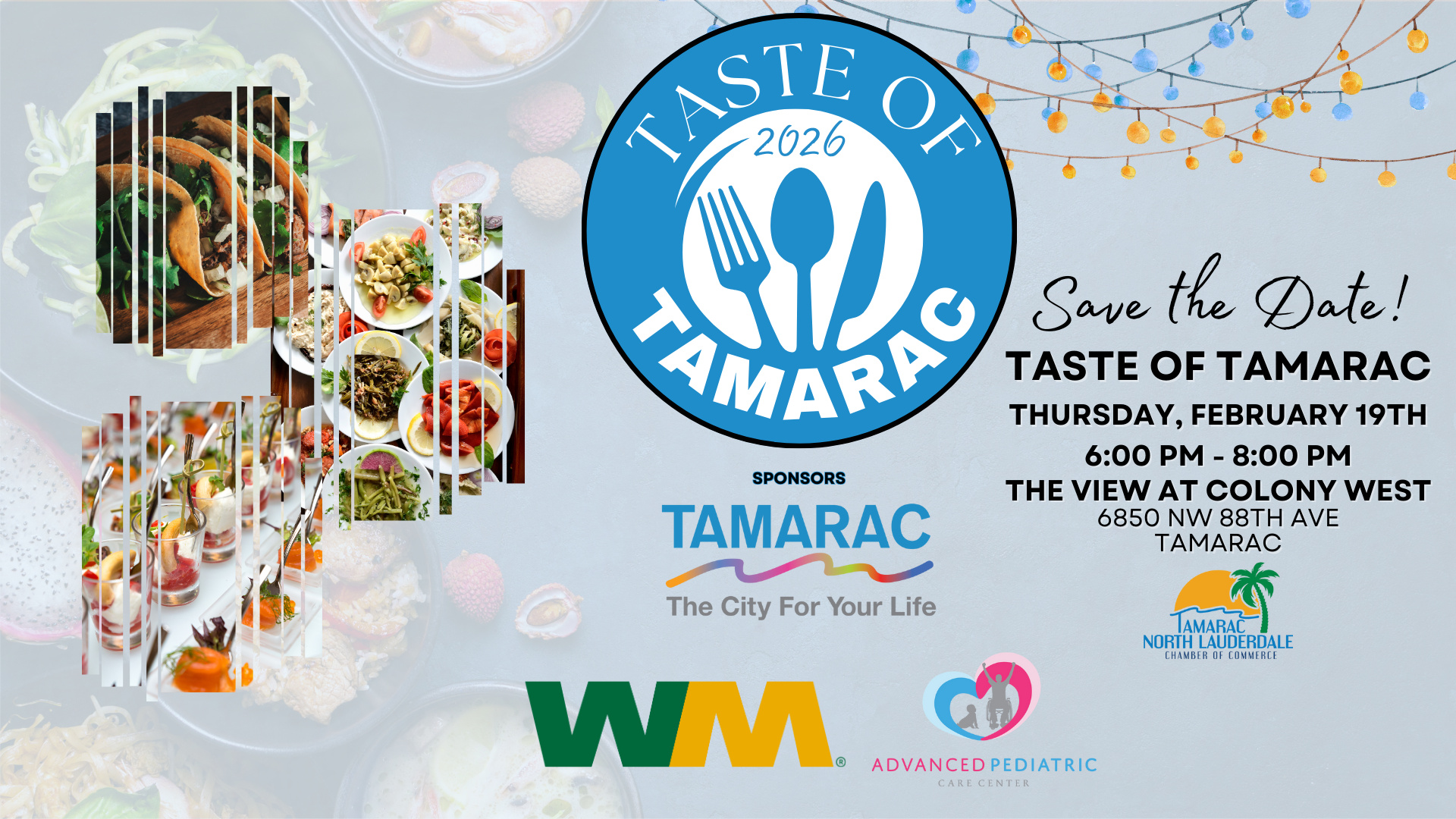 Residents, businesses, visitors you are cordially invited to the "Taste of Tamarac" event, taking place on Thursday, February 19th, from 6:00 PM to 8:00 PM at Colony West, located at 6850 N. Pine Island Rd., Tamarac, FL 33321.
